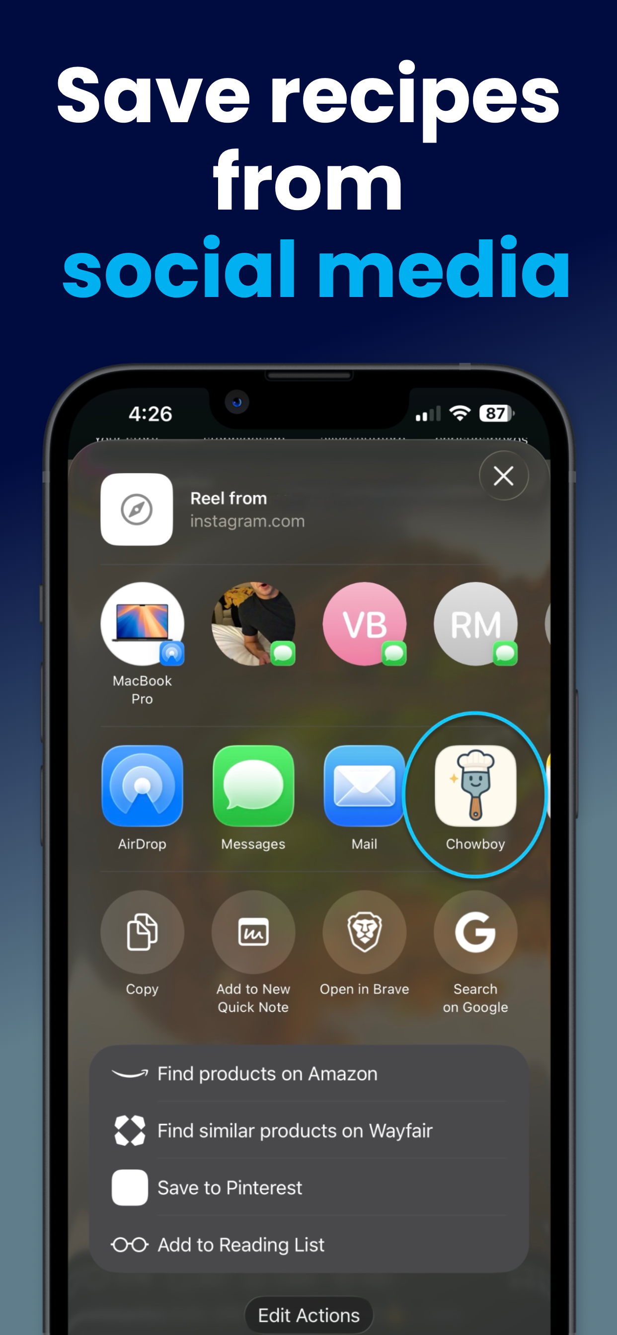 See something delicious while scrolling? Share it straight to Chowboy. One tap — recipe saved, cleaned up, and ready to cook.